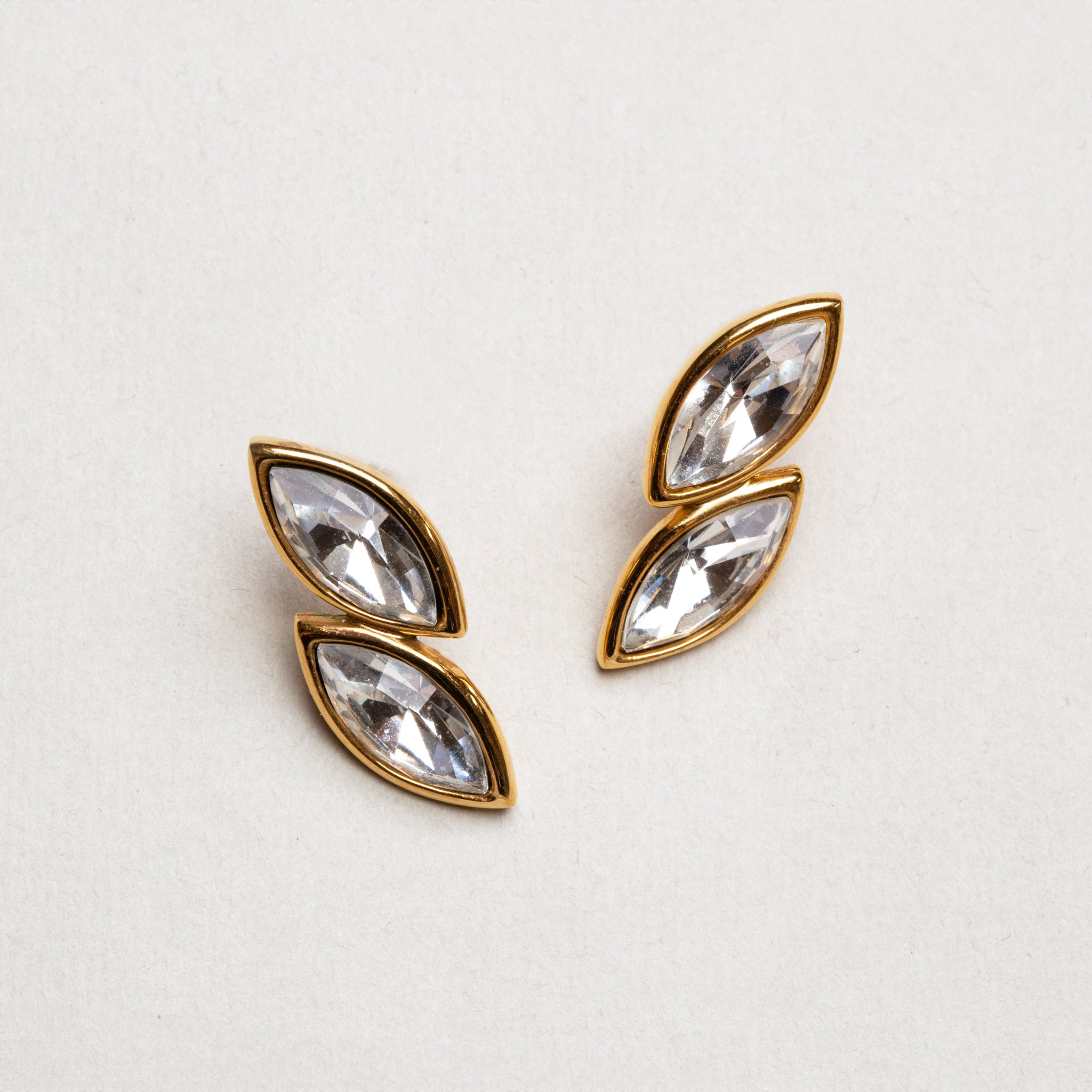 – Sold OutThis vintage Napier jewellery set captures the elegance and glamour the brand became known for throughout the mid-20th century. The set features a striking necklace and matching earrings, each designed with a continuous row of marquise-cut clear rhinestones framed in warm gold-tone settings.