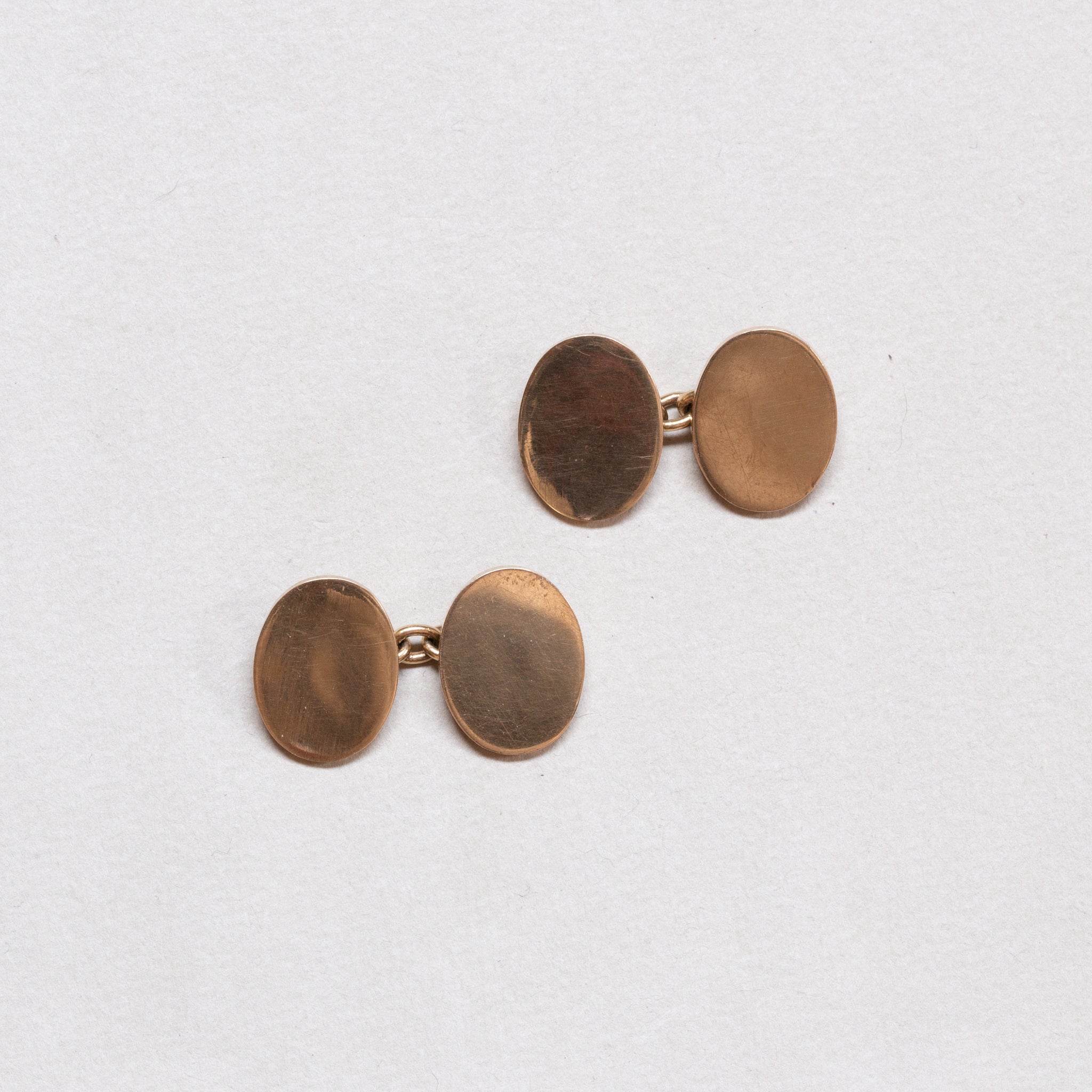 Measuring 17 mm tall and 13 mm wide, these refined cufflinks are crafted in solid 9ct gold and feature a classic double-oval design linked by short chains. Each oval face is fully hallmarked, indicating that they were made by the London jeweller, Cox & Fleet.