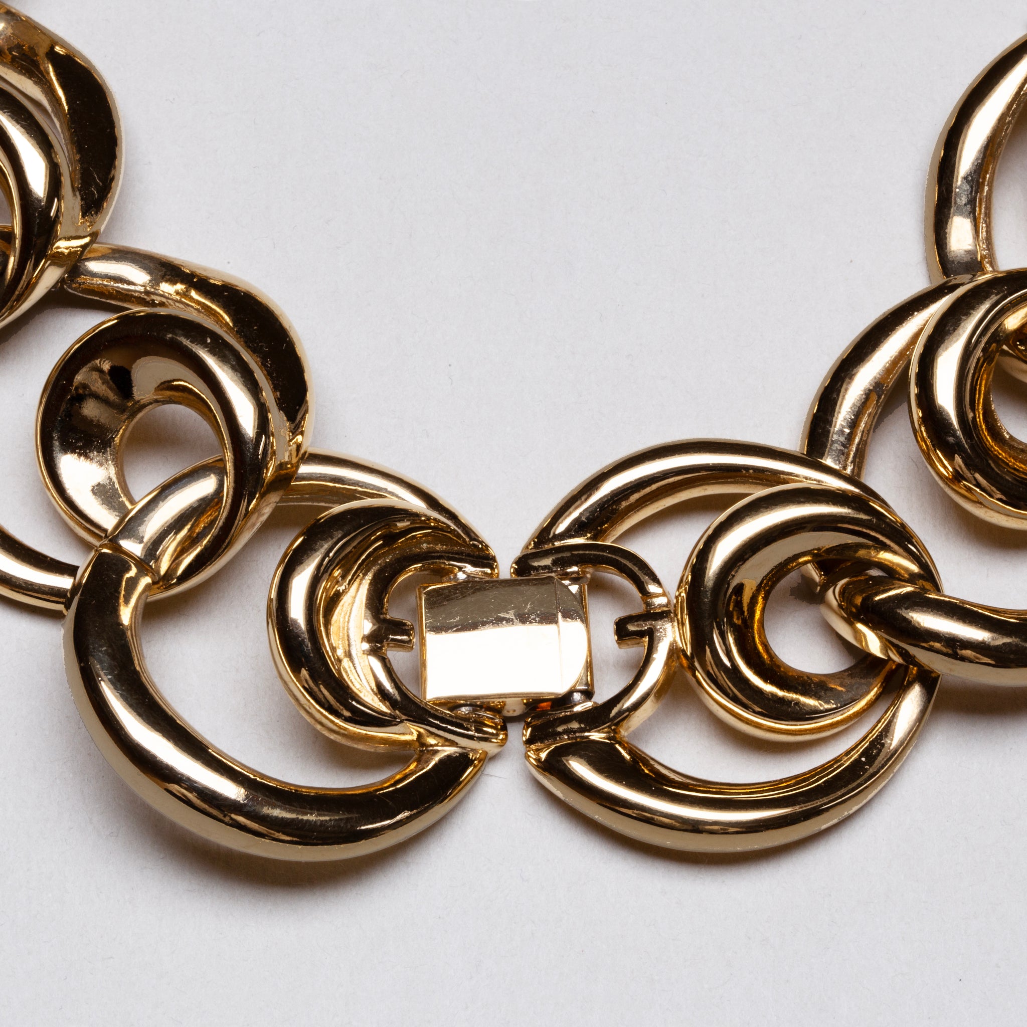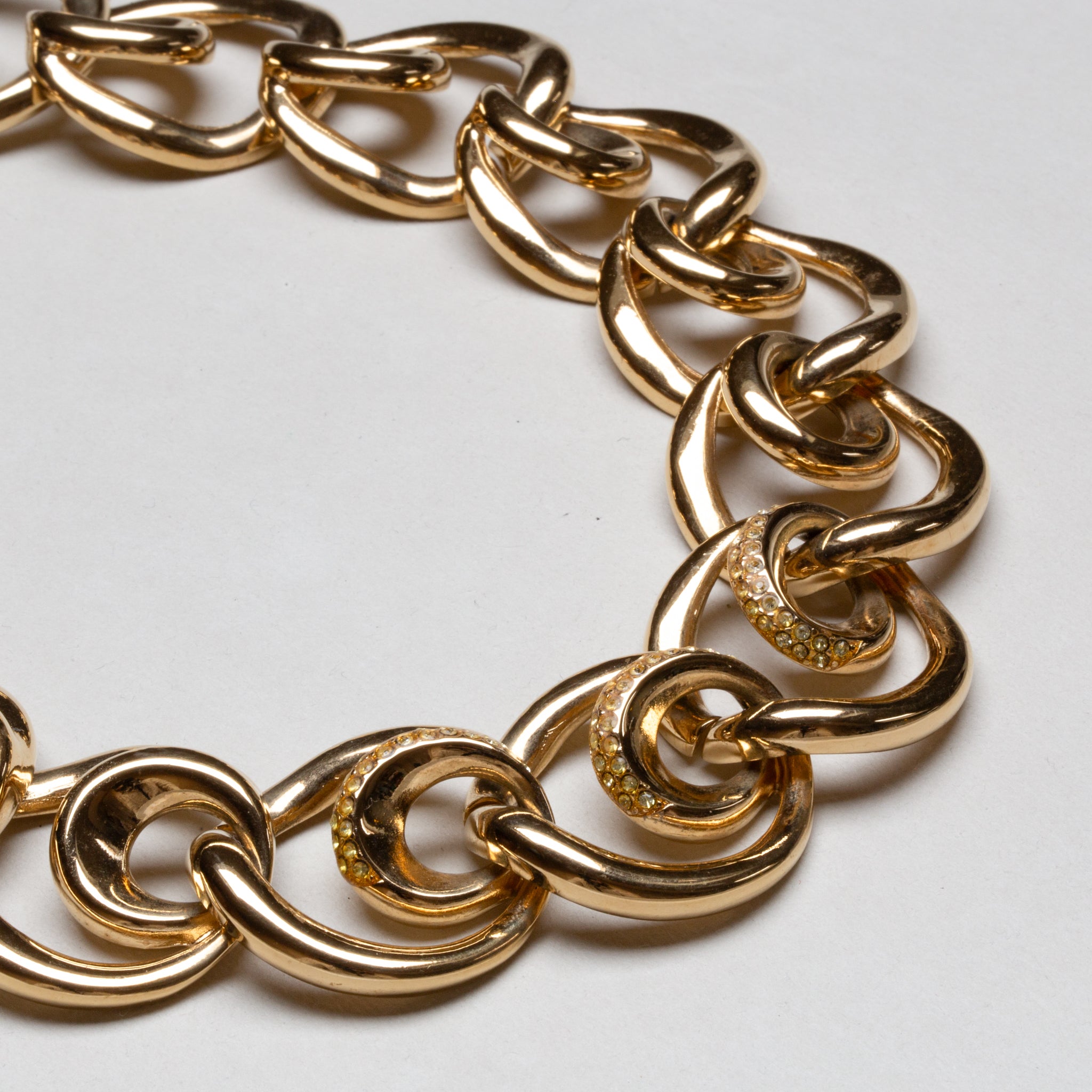 Vintage Givenchy gold-tone chain necklace featuring interlocking rounded links, accented with pavé-set rhinestones for a touch of subtle sparkle.