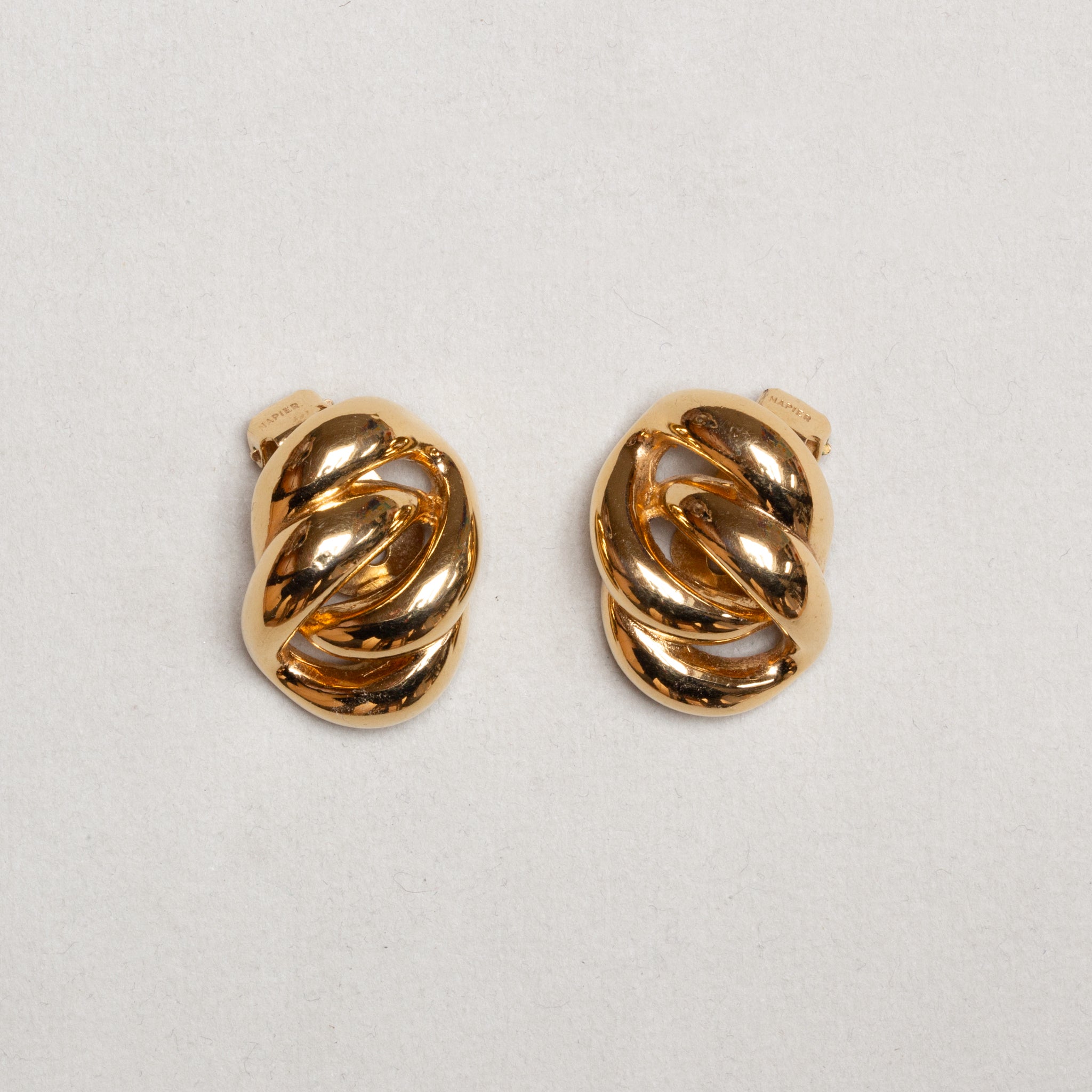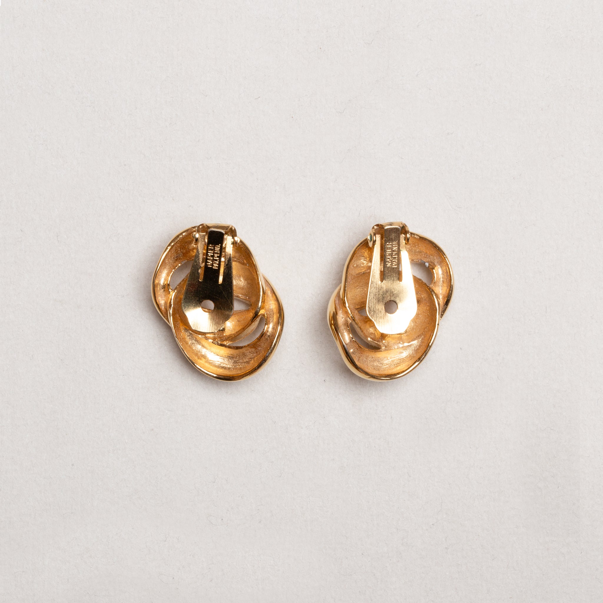 Crafted in gold-tone metal, these vintage Napier clip-on earrings feature a sculptural, interwoven knot design with a high-polish finish. They instantly evoke classic Old Hollywood glamour and add a refined statement to any look.