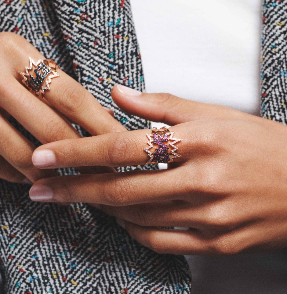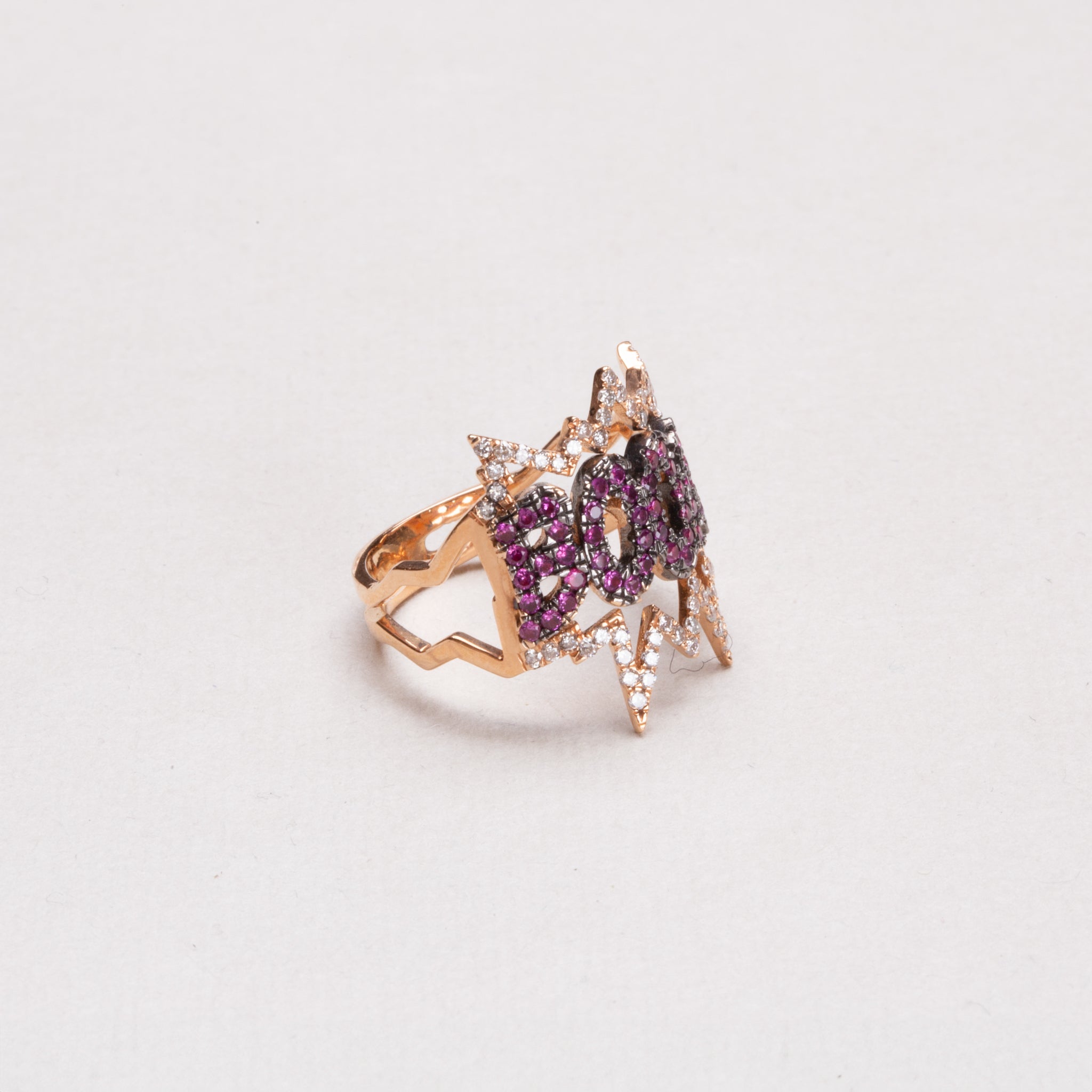 From Diane Kordas' Pop Art Collection, the BOOM Ring is crafted in 18k rose gold and set with 0.39ct white diamonds and 0.42ct pink sapphires. Inspired by artists like Roy Lichtenstein, the design reflects Diane’s passion for modern art and graphic design.
