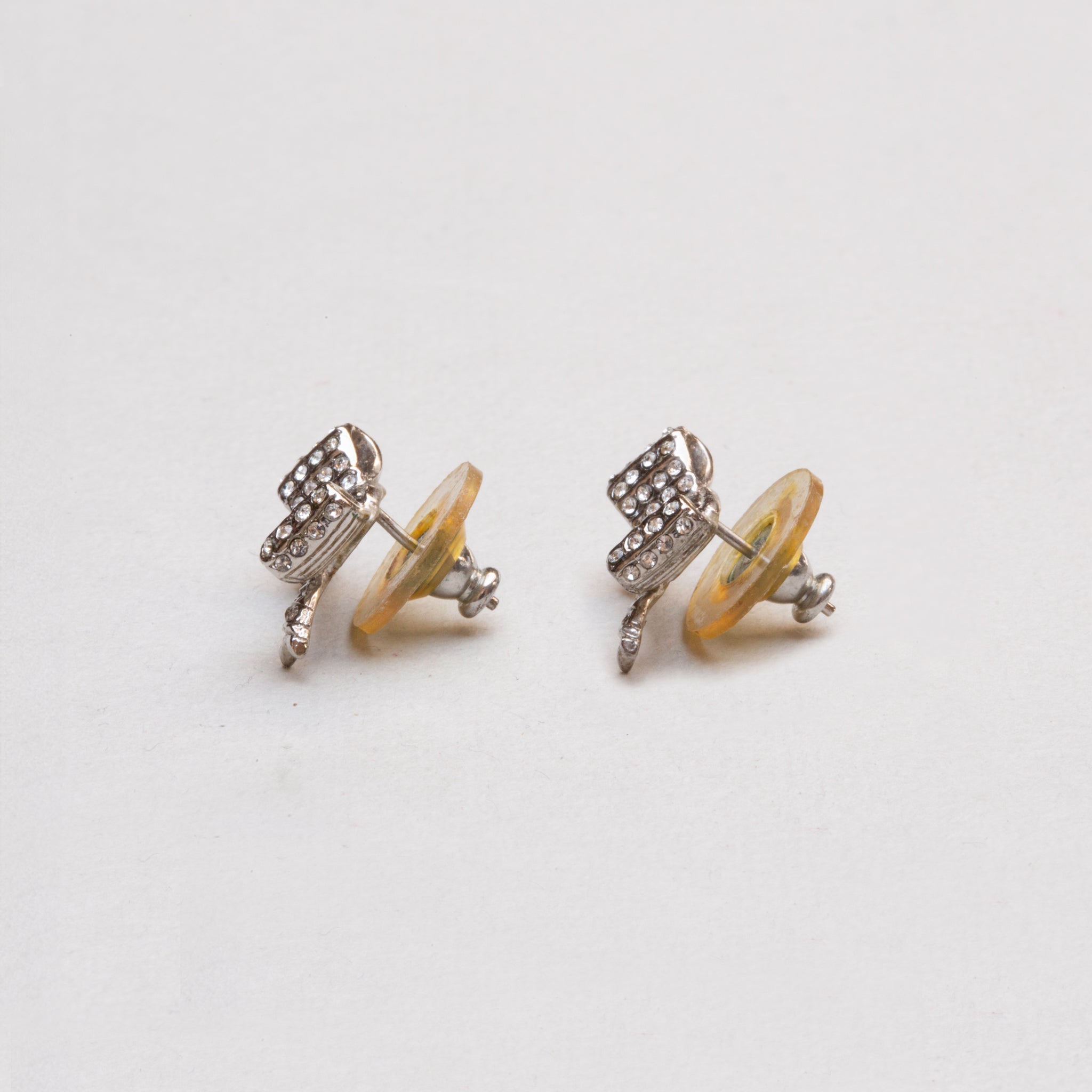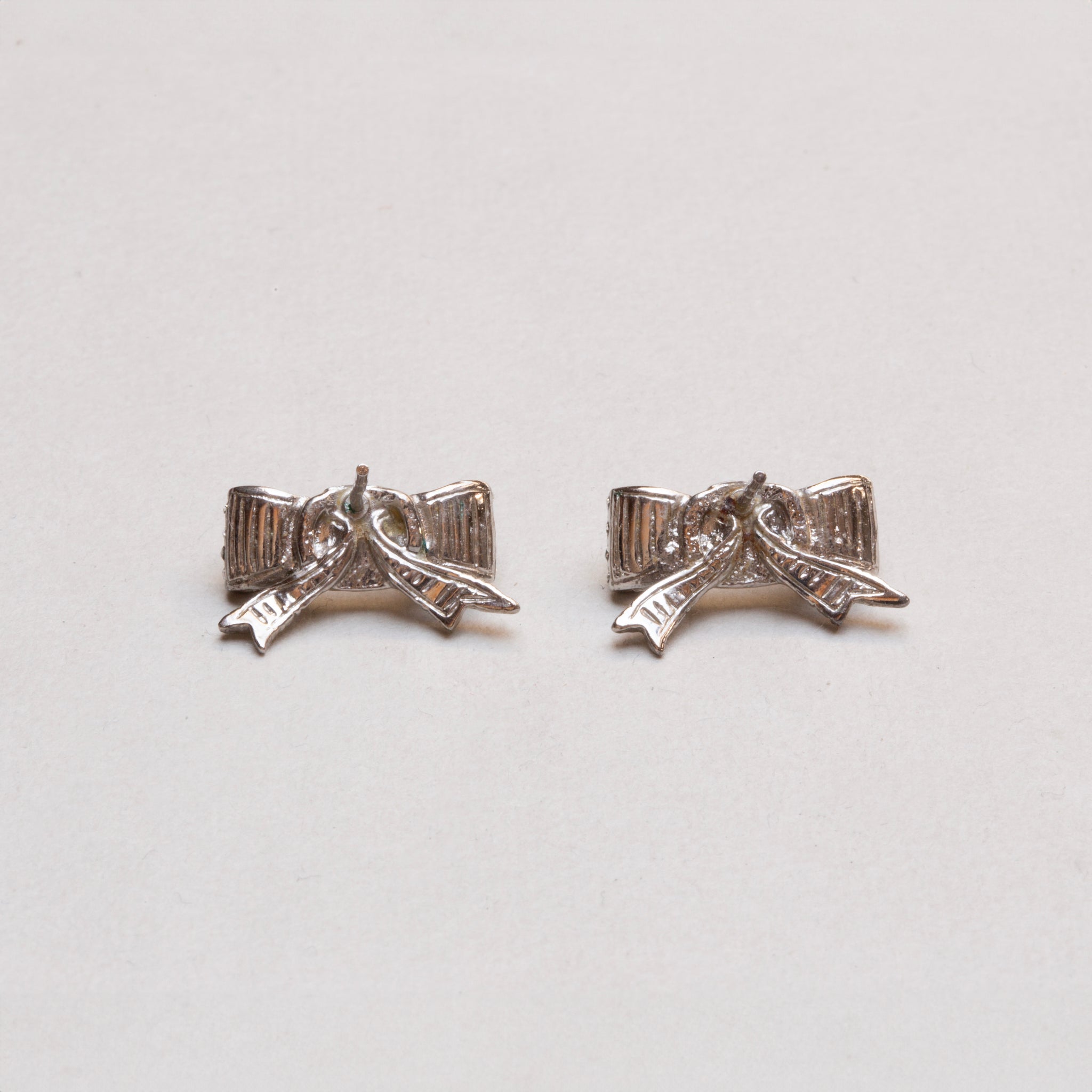 These vintage Ferragamo stud earrings feature an elegant bow design, encrusted with clear rhinestones and stamped "Ferragamo". Crafted in a silver-tone finish, they reflect the brand’s signature blend of classic femininity and refined glamour.