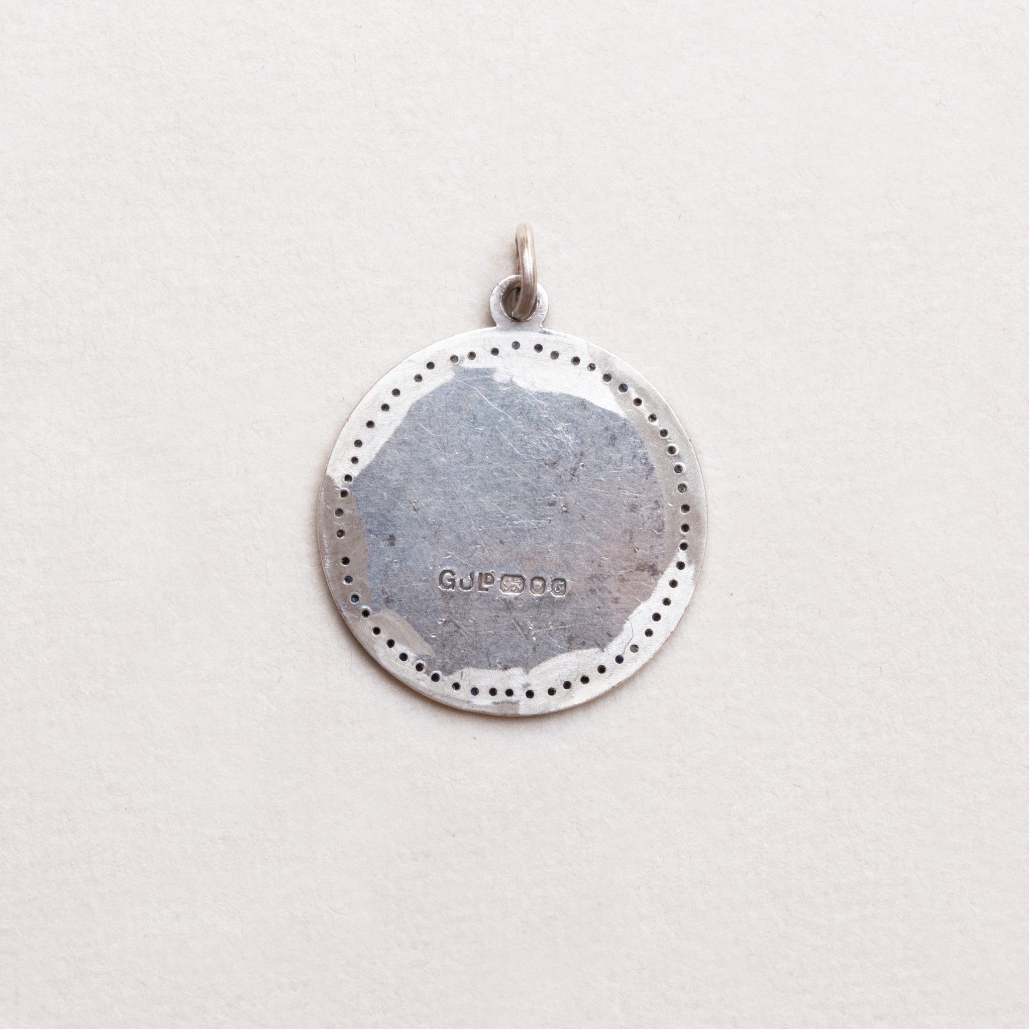 Made of sterling silver with sapphires, this pendant measures 25 mm in diameter with a 7 mm jump ring.