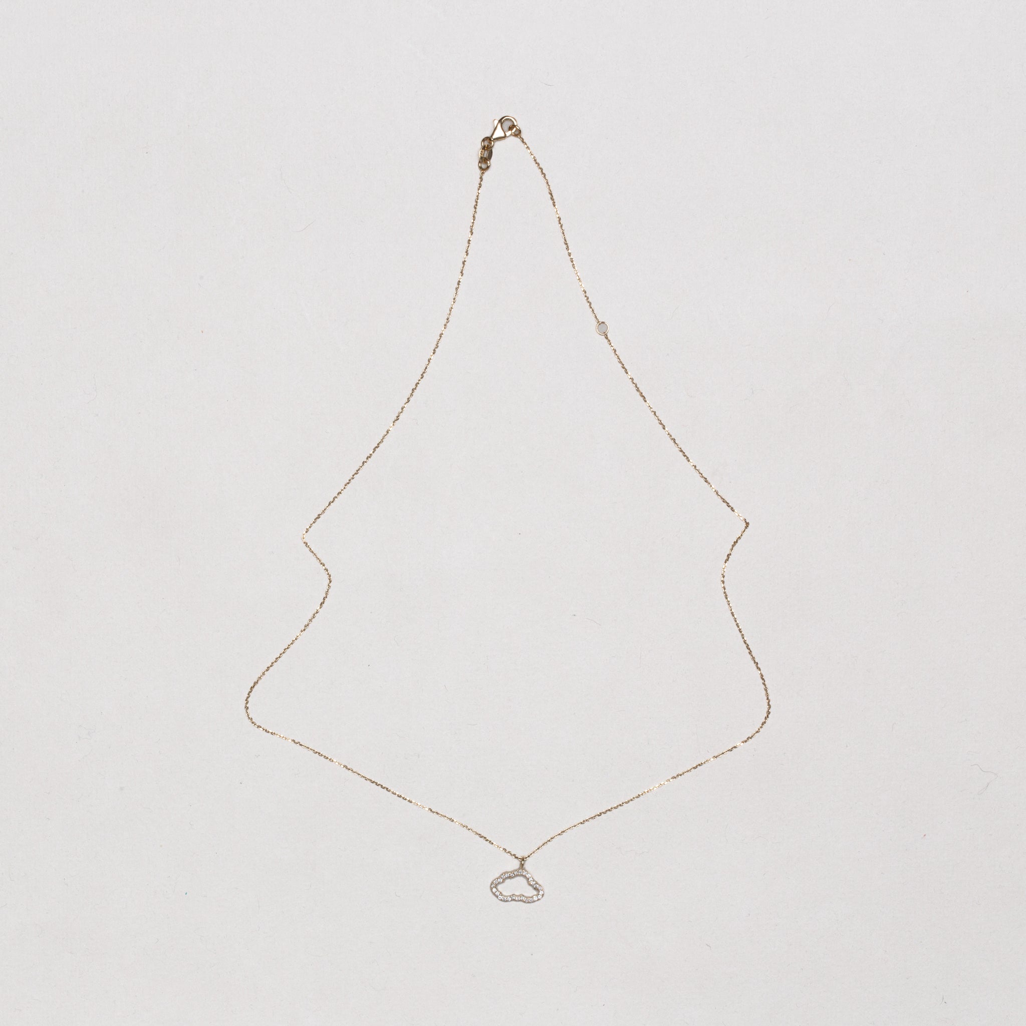 The centrepiece is a delicately crafted cloud pendant, outlined with pavé-set diamonds that catch the light from every angle, creating a subtle sparkle against the warm gold tones.