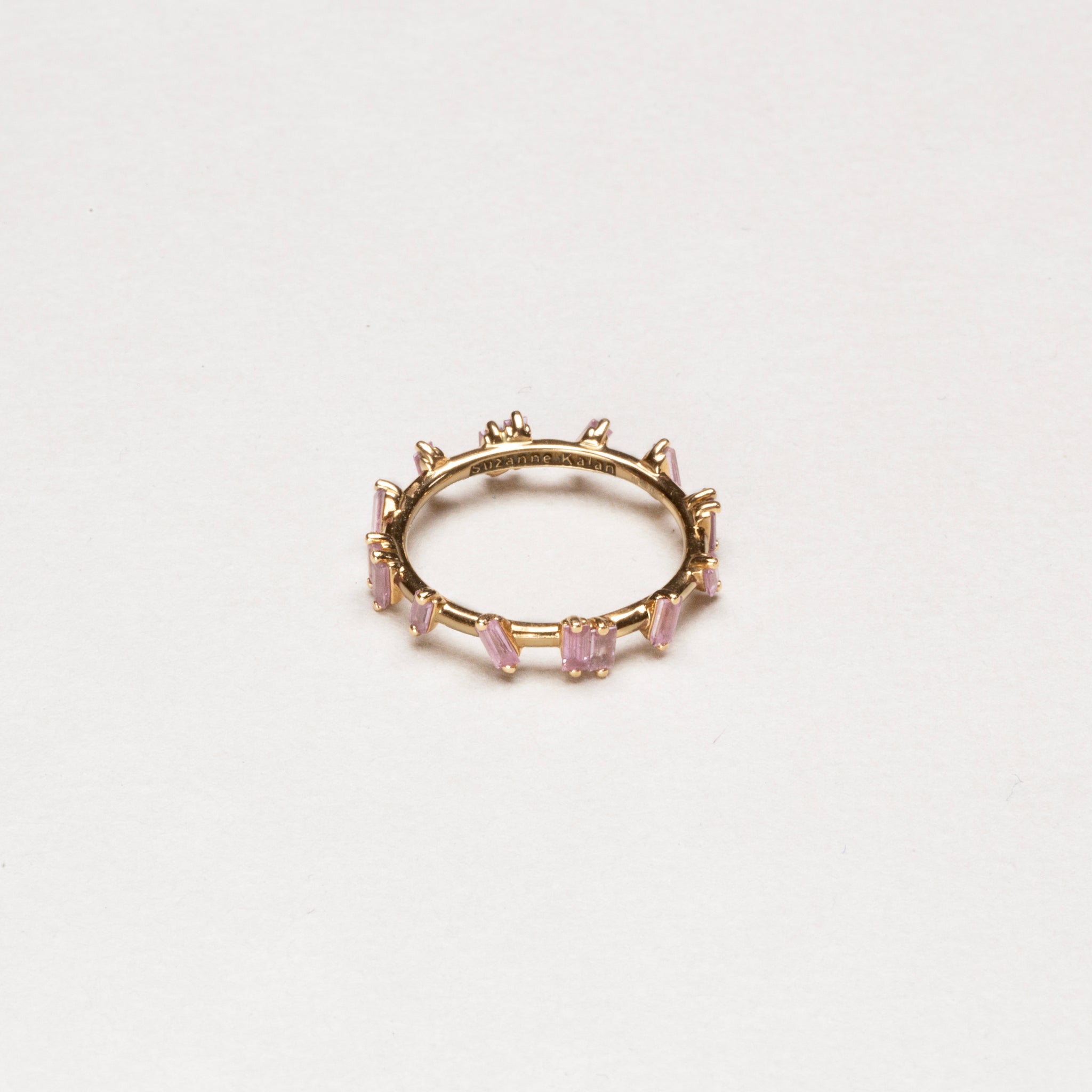 Inspired by the edgy elegance of barbed wire, this striking ring from Suzanne Kalan is handcrafted from 18ct gold and set with 0.85 carats of baguette-cut pink sapphires in the designer’s iconic Fireworks setting. The arrangement of sapphires creates a dynamic, light-catching effect that feels both modern and effortlessly refined.