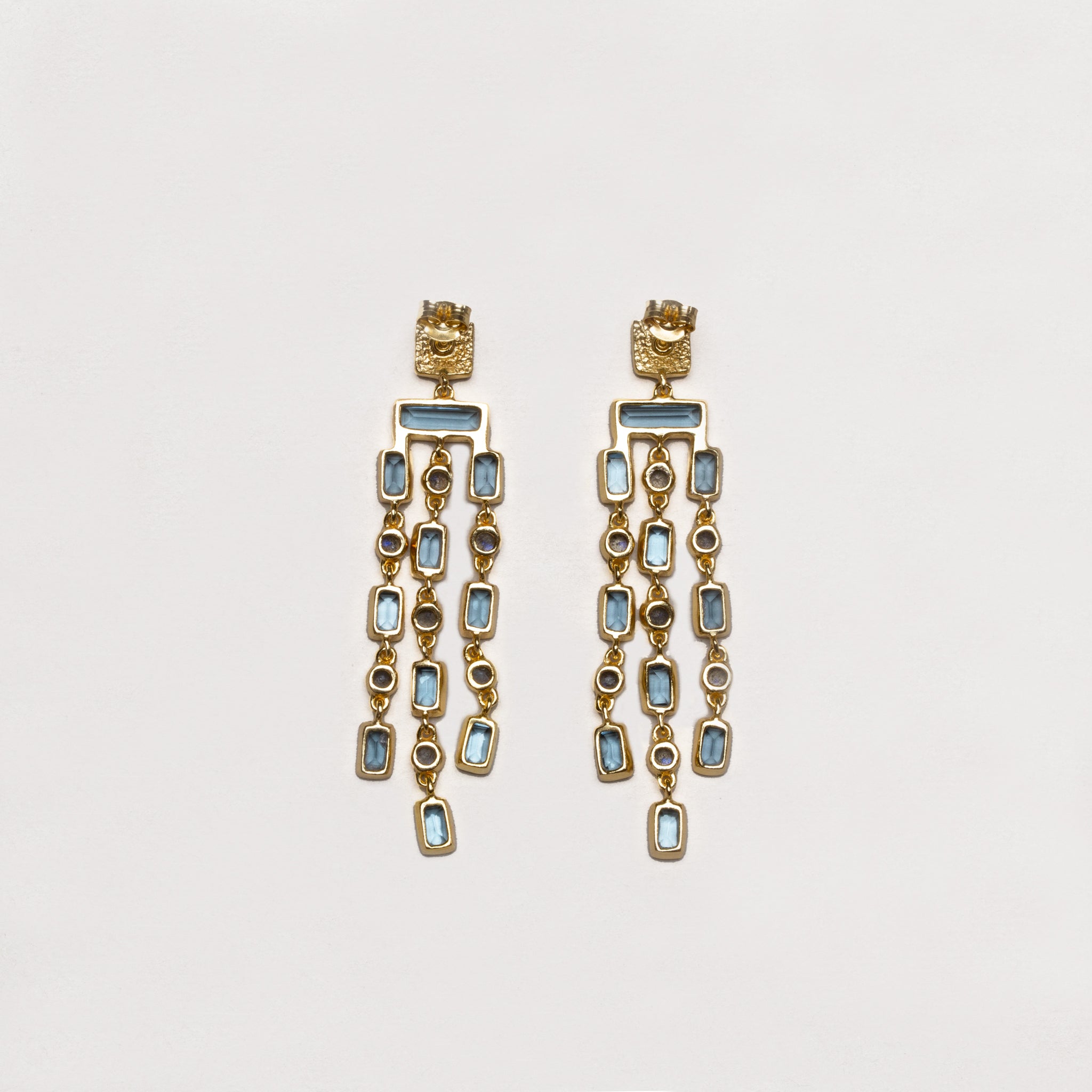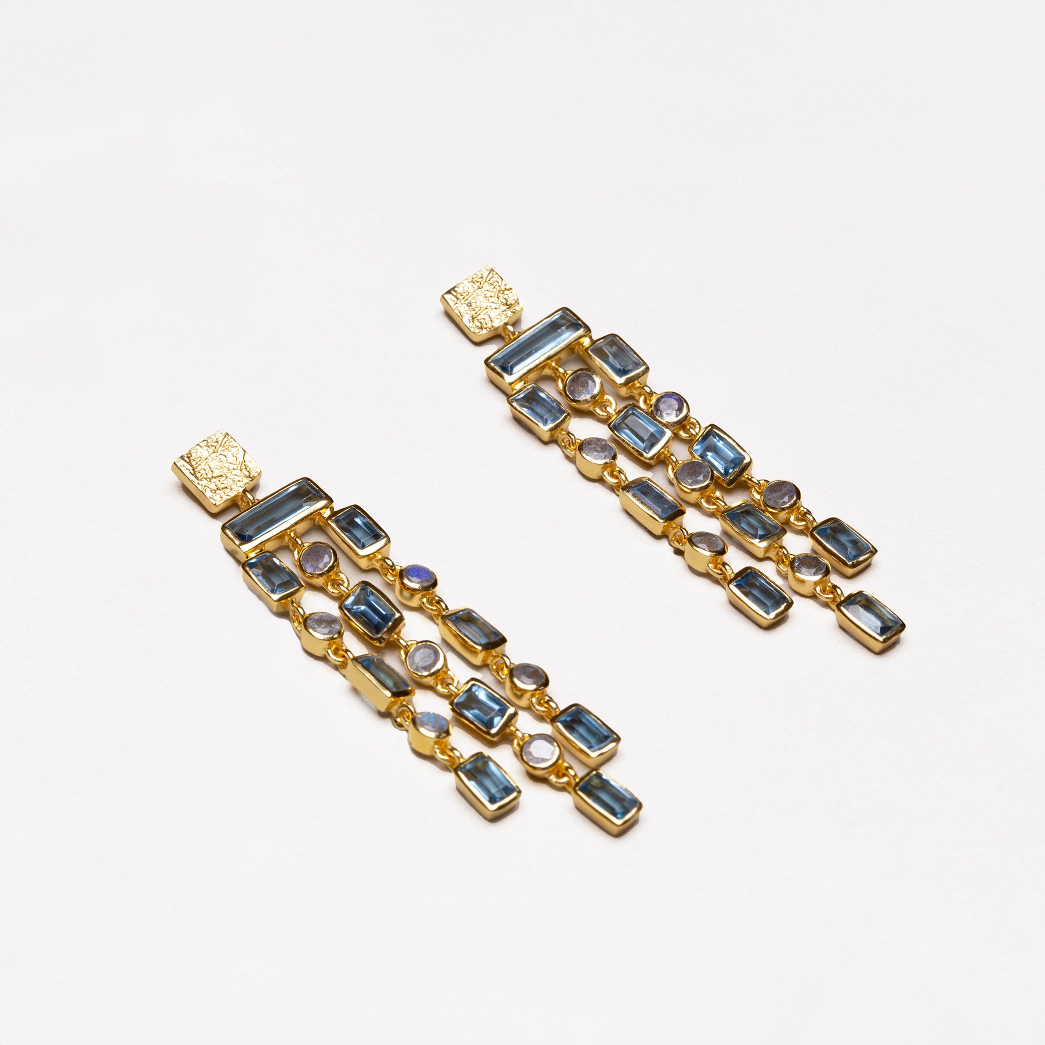 These triple-row gemstone earrings are meticulously crafted in 18k gold vermeil. Designed to make a statement, they feature a vibrant cascade of gemstones set in three elegant rows to achieve a dramatic chandelier silhouette with square, textured studs.