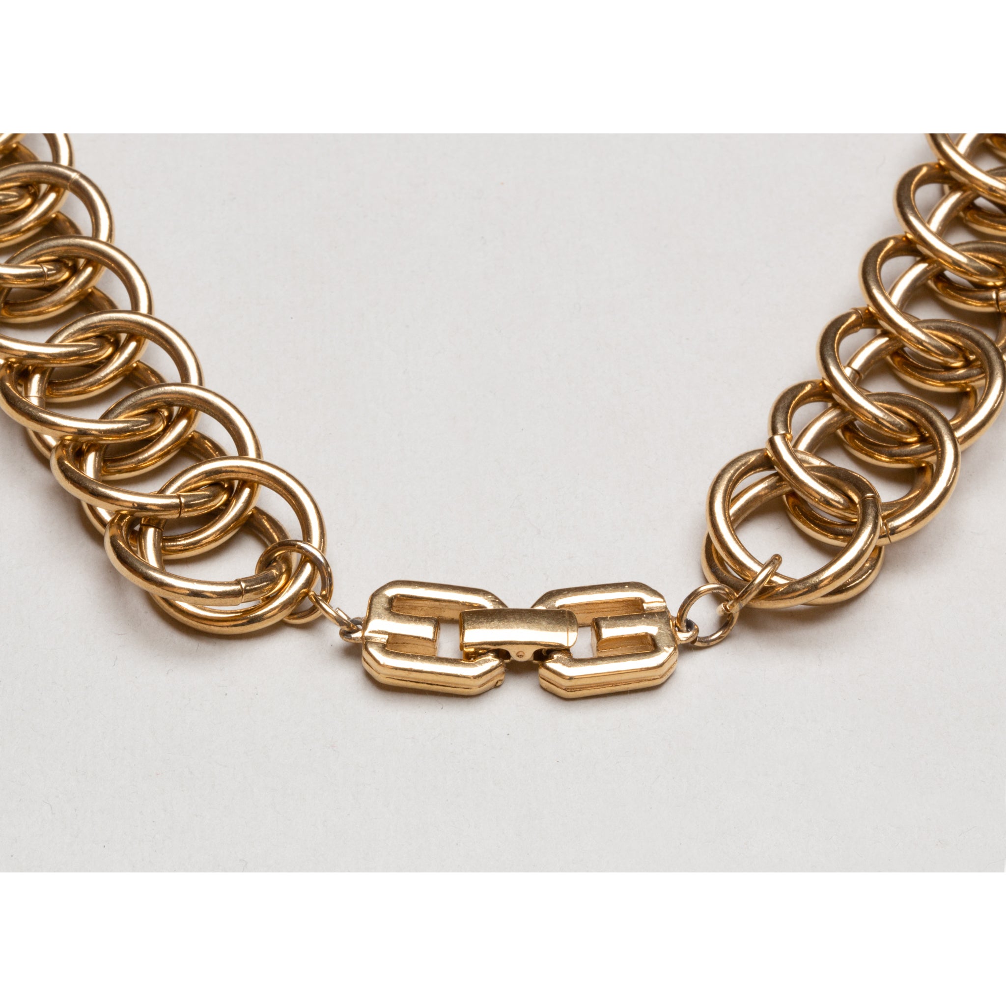 Another vintage gold-tone chain necklace by Givenchy, constructed from a continuous sequence of double-ring links, each formed from two smooth circular hoops interlocked to create a dense, dimensional chain.