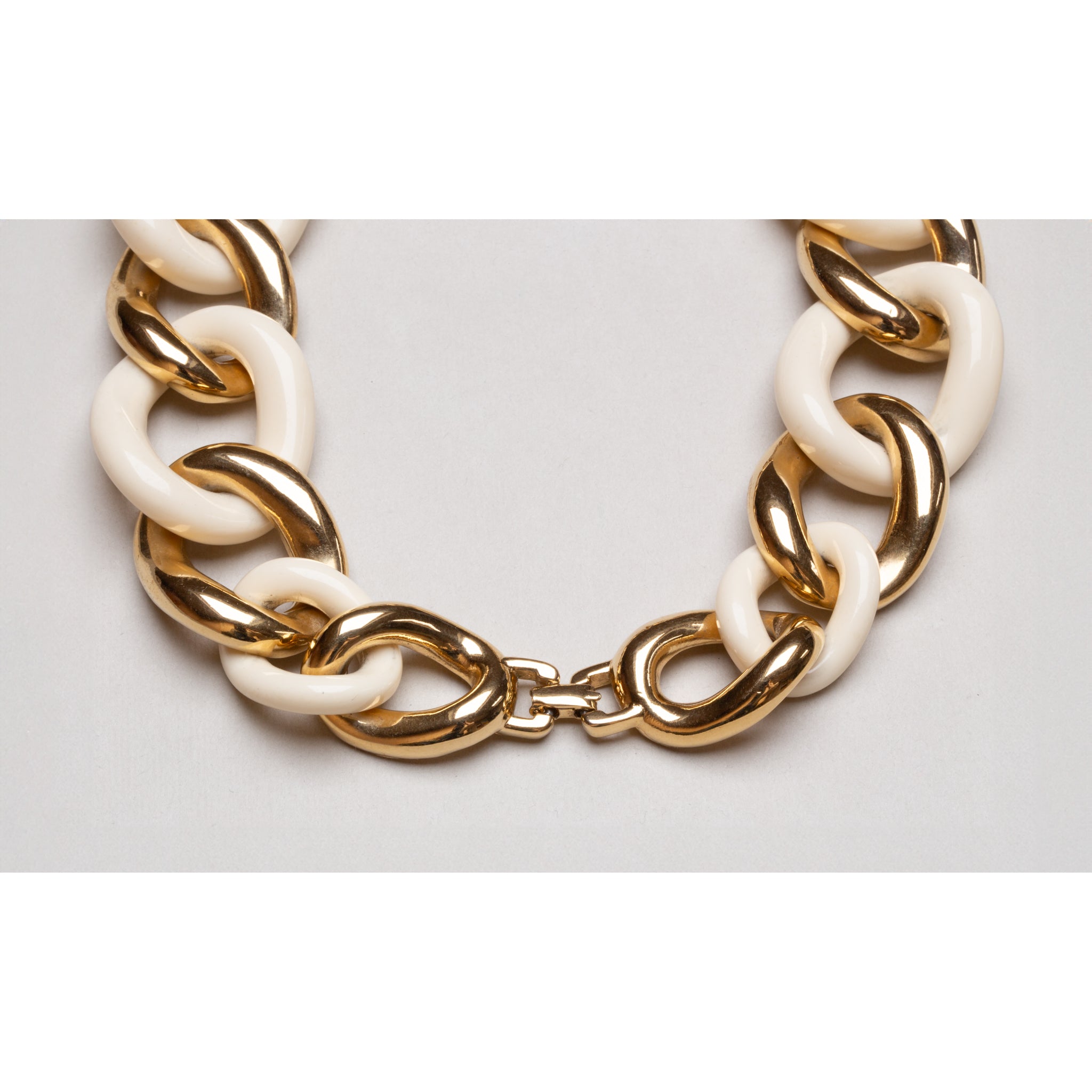 Vintage Givenchy chain necklace composed of oversized oval links in alternating finishes. - smooth, glossy ivory-colored links are interlocked with polished gold-tone metal links, creating a balanced two-tone contrast.